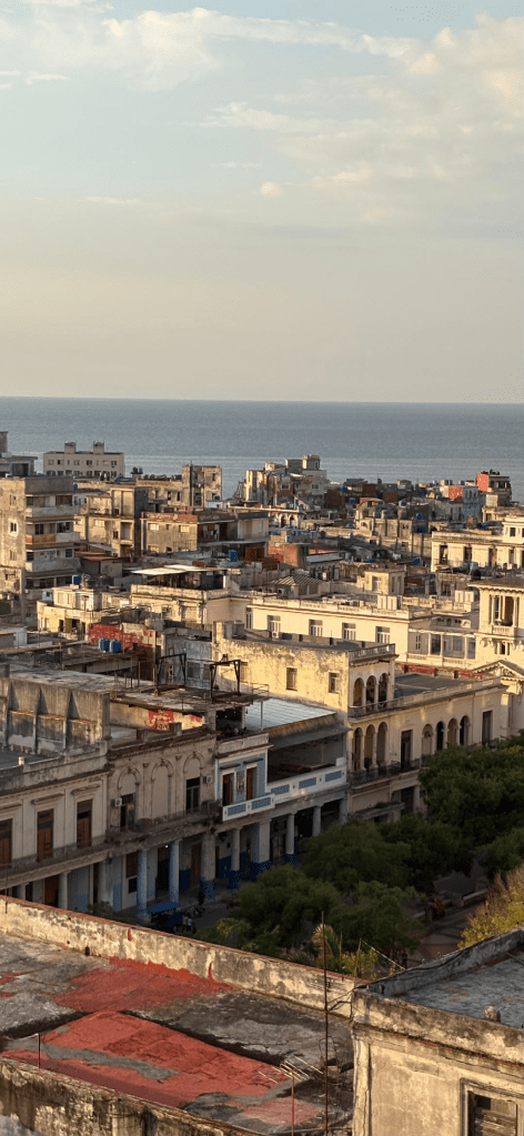 We had a very knowledgeable Cuban guide with us, Vicky, who answered all of our many questions and continually provided historical background and context. We learned how difficult it is to live in Cuba now. Cuba relies on the tourist industry which has been severely curtailed. It was very much affected by Covid and never really came back. With the current fuel shortage, many tour groups have canceled. It is difficult for locals to get around, even to get to work. A young woman who worked in the hotel at the front desk has to get up at four in the morning to get on one of the few running buses to make it to work. We also saw makeshift open taxies with people piling in. There were lines in front of the banks. There was garbage piled up all over as trash collecting can’t be done. There are few open stores, certainly not many large markets and only a state-run department store. People sell food stuffs from their porch or garage.